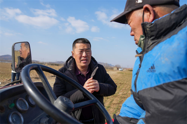 ??????↑ 2月15日,山東省威海市文登區金農會農業專業合作社負責人于進海和農機手討論施肥方案。