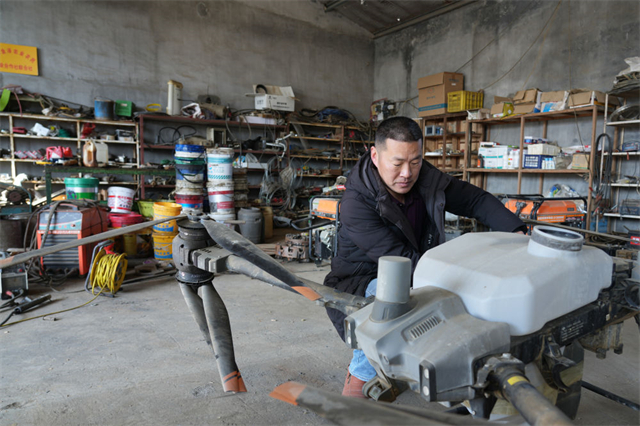 ??????↑ 2月15日,山東省威海市文登區金農會農業專業合作社負責人于進海在檢修農業無人機。