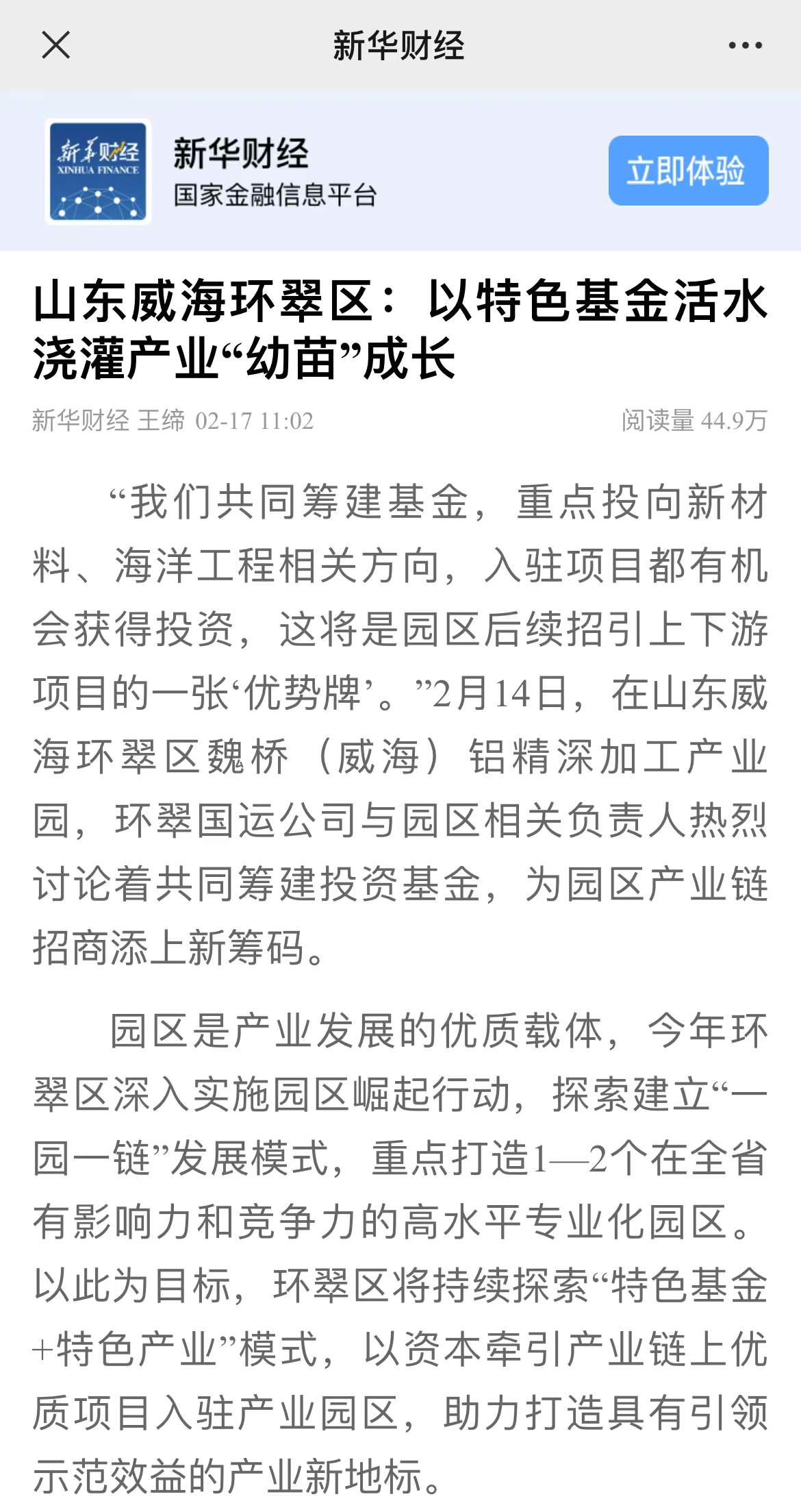??????2月17日,新華財經發布文章《山東威海環翠區:以特色基金活水澆灌產業“幼苗”成長》,報道環翠區以資本牽引產業鏈上優質項目入駐產業園區,推動園區產業集群發展的相關情況,以下為報道全文——