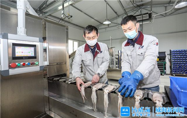 ??????在威海福瑞機器人車間里,技術(shù)人員正在試驗第五代魷魚加工機器。