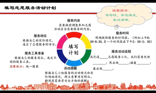 ??????學校成立課程開發(fā)小組,開發(fā)志愿服務系列課程,針對“如何做好價值引領,如何開展志愿服務,志愿服務需要哪些技能”等學生所困惑的問題,定期由老師、專家、后勤人員開展關于志愿服務方式方法的培訓。????
