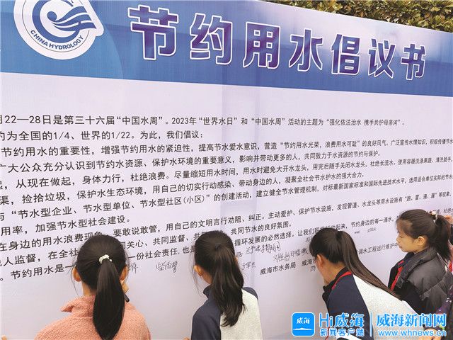 ??????啟動(dòng)儀式現(xiàn)場,市水務(wù)局聯(lián)合市水文中心、省調(diào)水工程運(yùn)行維護(hù)中心威海分中心、市水務(wù)集團(tuán)共同開展節(jié)水宣傳活動(dòng),通過搭建主題展臺(tái)、宣傳看板、發(fā)放宣傳材料、發(fā)布節(jié)約用水倡議書等方式,營造惜水、節(jié)水、愛水的濃厚氛圍。威海高區(qū)實(shí)驗(yàn)小學(xué)近百名學(xué)生也來到現(xiàn)場,結(jié)合威海特色,進(jìn)行“共繪一幅山水畫”主題創(chuàng)作,以此強(qiáng)化愛水意識(shí)。