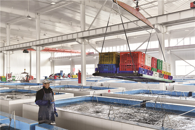 從凈化池中打撈凈化好的牡蠣。