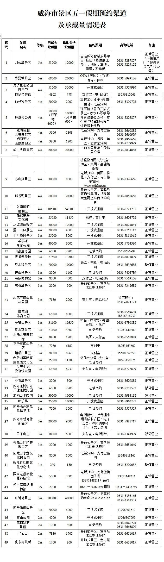 ??????根據國家文化和旅游部、山東省文化和旅游廳關于五一假期旅游景區有關工作部署,五一期間,我市旅游景區將進一步落實各項安全工作措施,實行預約開放,以保障廣大游客的切身安全。威海市文化和旅游局提醒您: