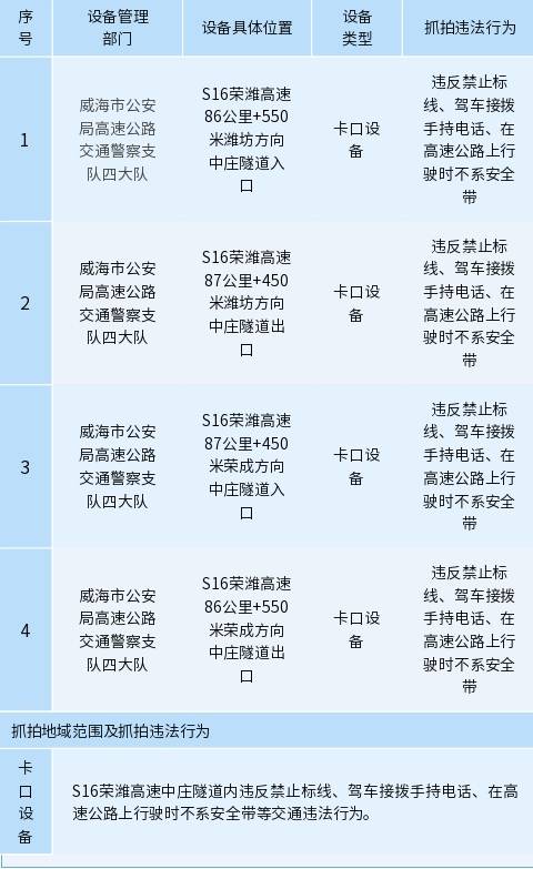??????為保證道路交通安全,預(yù)防和減少道路交通事故的發(fā)生,根據(jù)《中華人民共和國道路交通安全法》《公安機(jī)關(guān)執(zhí)法公開規(guī)定》等法律法規(guī),威海市公安局高速公路交通警察支隊四大隊新增2處共4個交通技術(shù)監(jiān)控設(shè)備,現(xiàn)予以公示,自5月12日起,將對有關(guān)交通違法行為進(jìn)行依法管理,請廣大交通參與者自覺遵守道路交通法律法規(guī),共同維護(hù)良好的道路交通環(huán)境。