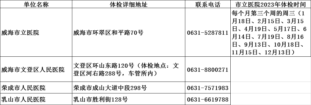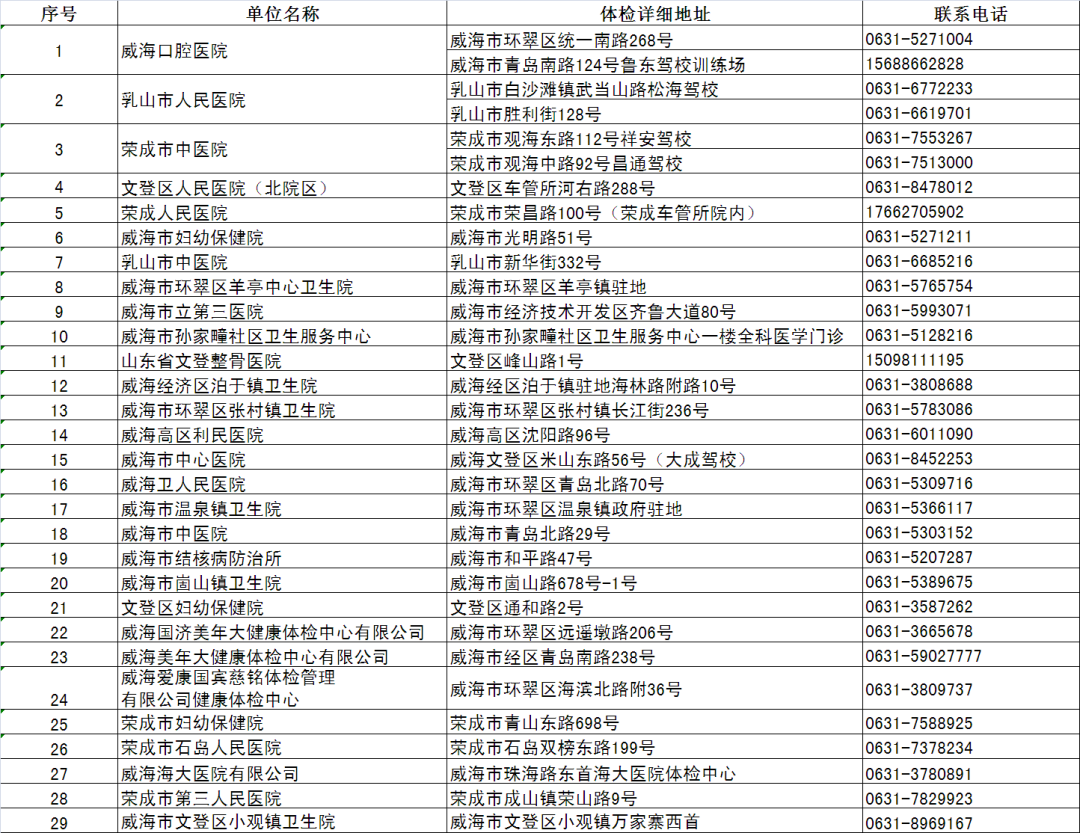??????根據威海市衛健委提供的具備健康體檢資質的醫療機構名單,經醫療機構申請,威海市公安局交通警察支隊審核相關資料后,確定以下體檢醫療機構可以開展除C5類外的其他機動車駕駛人提交身體條件證明業務。具體名單如下: