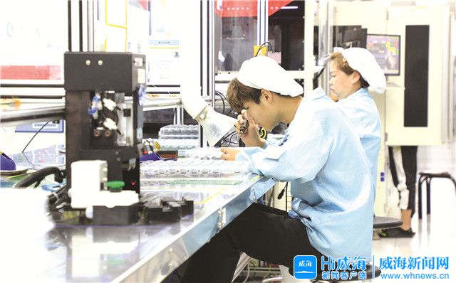 在愛思特傳感技術(shù)有限公司生產(chǎn)車間內(nèi),工人正在生產(chǎn)組裝超聲波傳感器。Hi威海客戶端記者 謝菁/攝