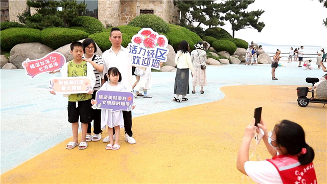 “除悅海公園燈塔外,經開區(qū)還在韓樂坊商圈設置了一處新時代文明實踐志愿服務站,組織志愿者為游客提供旅行指引等相關服務,并準備了‘活力經開區(qū)歡迎您’等10余種手舉牌供游客現場拍照打卡,同時免費發(fā)放《樂享經開區(qū)導覽圖》,得到了不少游客的‘五星好評’。”經開區(qū)文明辦相關負責人表示,目前最受歡迎的服務是行李寄存和協(xié)助拍照。