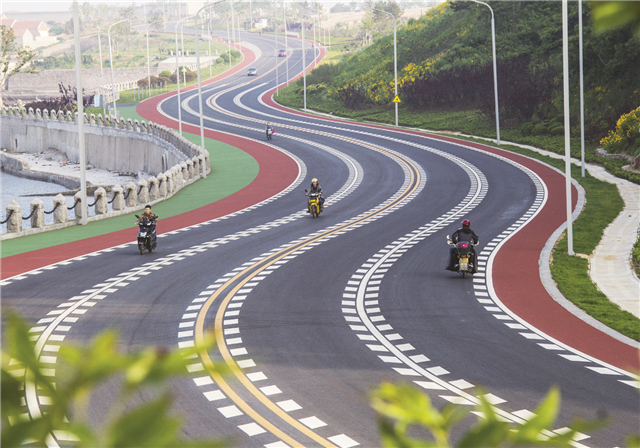 ????千里山海自駕旅游公路在榮成值得打卡的路段眾多,比如青魚灘附近的“彩虹公路”,不僅與山海相鄰,公路兩側還是紅色與綠色的濱海步道,中間是黃色的隔離線,俯拍整條公路,就像一道巨大的彩虹鋪在山海間,被網友稱作“中國最美海濱彩虹公路”。