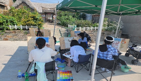 ??????在煙墩角村,團隊先來到村委處對該村整體情況進行進一步了解。由于煙墩角村擁有天鵝湖、海草房等特色因素,在當前所處的夏季成為周邊及外地學生的寫生首選對象,實踐隊前往該村寫生基地展開調研。在與該村干部及寫生基地負責人的訪談中了解到,相關負責人通過多年來的努力,已將寫生基地打造成集“畫、吃、住”為一體的場所,為前來寫生及實踐的學生和游客提供周全的服務,并與多所高校及協會建立穩定的合作關系。