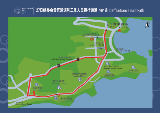 ??????一是自行車比賽路線改為從轉換區出發,向南經香庭灣小區第一路口右轉,經環海路、菊花頂路、半月灣隧道至萬福鄰里市集處折返,經半月灣隧道、環海路(公交站點)右轉,回到半月路轉換區,單圈5千米,共需騎行8圈;