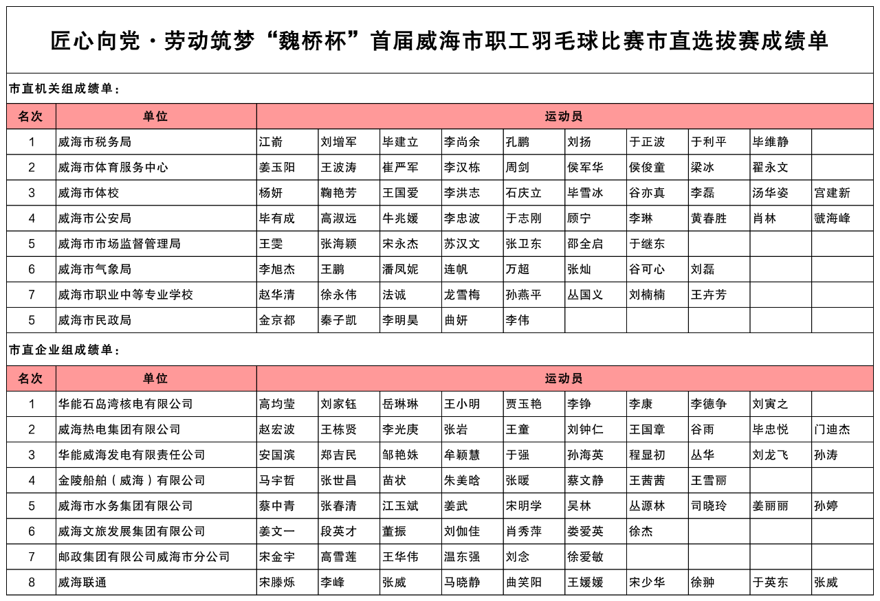 9月8日,由威海市總工會、威海市直機關工委、威海市體育局共同主辦,以“匠心向黨·勞動筑夢”為主題的“魏橋杯”首屆威海市職工羽毛球比賽市直選拔賽在威海乒羽健身中心四樓圓滿收官。