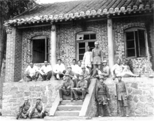 ??????文城解放當天,東海軍分區政治部主任張少虹(石階前排右一)、東海敵工股副股長郝香齋(后排右一)、榮成獨立營營長周文茂(坐前排右二)、文登獨立營營長劉劍秋(前第二排右一)與副政委劉進(前第二排右二)、敵工人員于云海(后排左一)等在文山玉皇廟前留影。