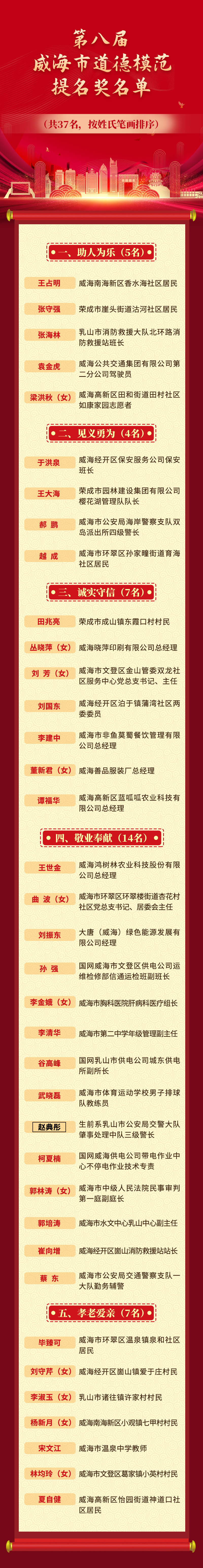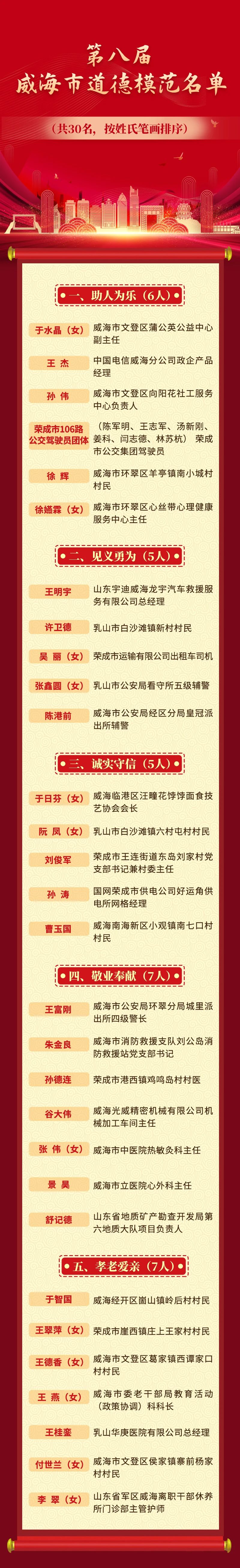 ??????按照從嚴把關、優中選優的原則,經過嚴格規范的評選程序,市文明委決定,授予于水晶等30名同志第八屆威海市道德模范榮譽稱號,授予王占明等37名同志第八屆威海市道德模范提名獎。