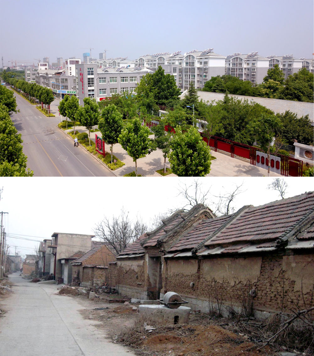 ??????這是一張拼版照片。上圖為濟南市章丘區三澗溪村新貌(新華社記者郭緒雷 攝,無人機照片);下圖為三澗溪村舊貌(資料照片)。