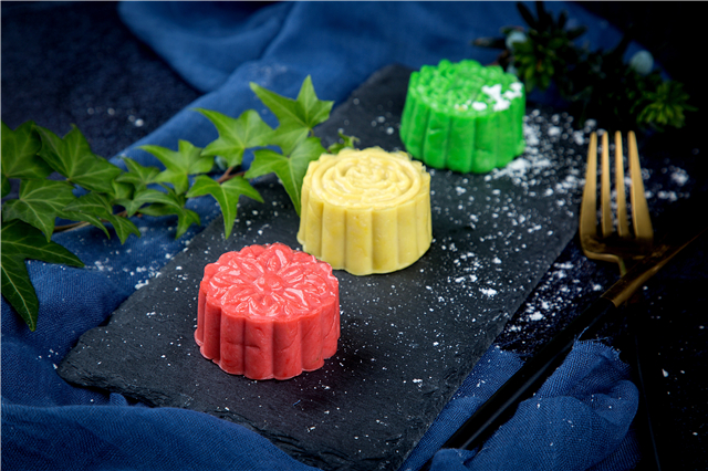 冰皮月餅的外皮是用糯米粉制成,外觀呈白色,內里多為水果餡和奶油餡,皮薄軟糯,吃上有冰淇凌般的冰涼口感。現在市場上很多冰皮榴蓮月餅、生耶拿鐵月餅等等,受到年輕人的追捧和喜愛。