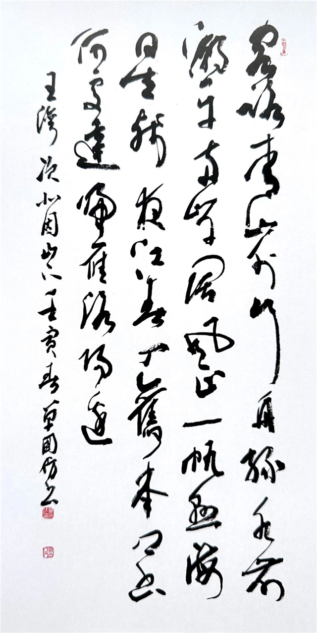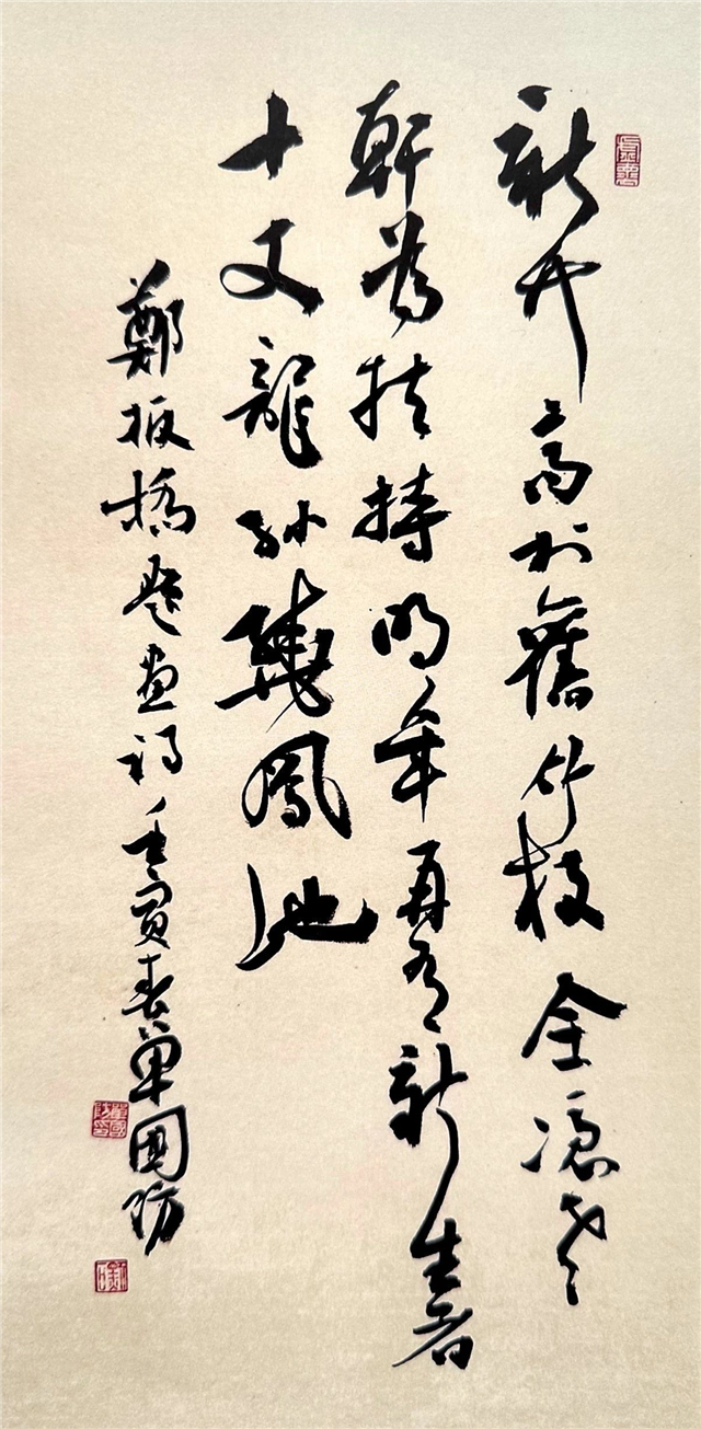 國防先生此次所展四十幅近作,內(nèi)容多為古詩名聯(lián)佳句,體裁形式豐富,泥古篆籀漢隸,師從魏晉兼汲右軍韻致,參以蘇米灑脫、旭素恣意,兼融王鐸跌宕、傅山爛漫,成己形神,逸己風(fēng)韻,點畫鏗鏘,結(jié)體自然,筆墨中正,渾厚大氣,臻至氣脈貫通、章法和諧之佳境。襟懷云水,胸納萬有,底蘊既深厚,境界自高蹈,博大雄健之內(nèi)在素質(zhì),蓬勃開闊之時代氣象,皆呈格律嚴(yán)謹(jǐn),法度大備之象,足見時代作為與書法修為應(yīng)當(dāng)相互成就。