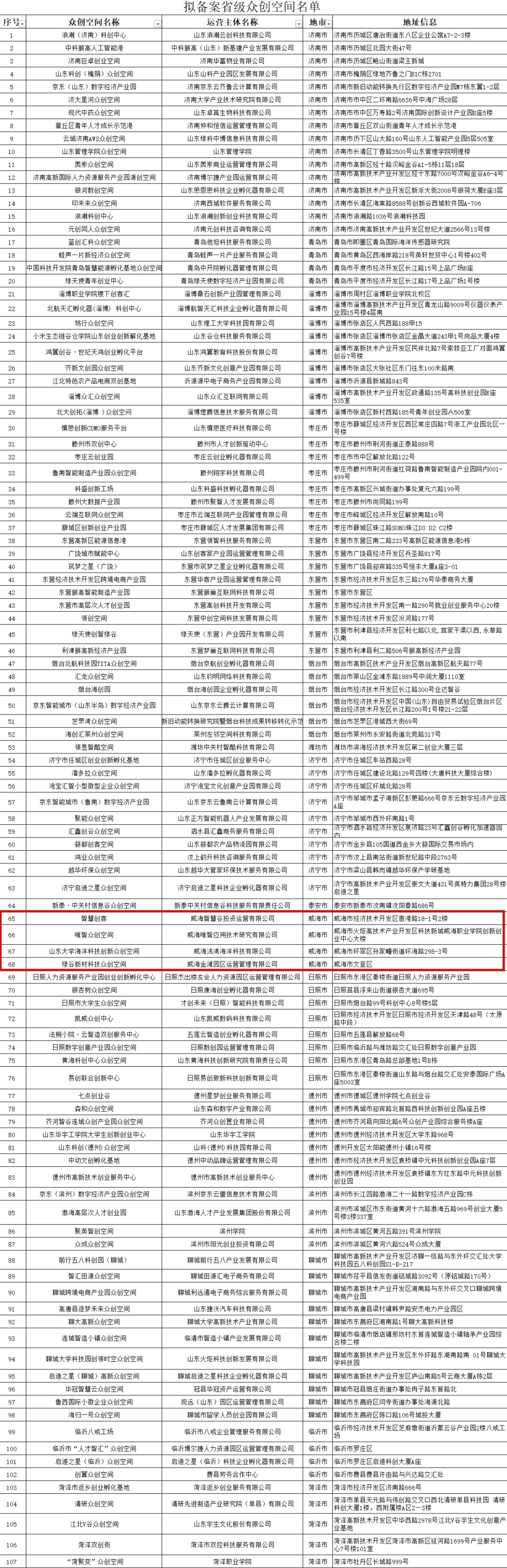 ??????10月16日,山東省科學技術廳發布《關于公示2023年擬認定(備案)省級科技企業孵化載體名單的通知》,其中,威海4家上榜,分別為智慧創客、唯智眾創空間、山東大學海洋科技創新眾創空間、綠谷新材科技眾創公司。擬備案省級眾創空間名單如下: