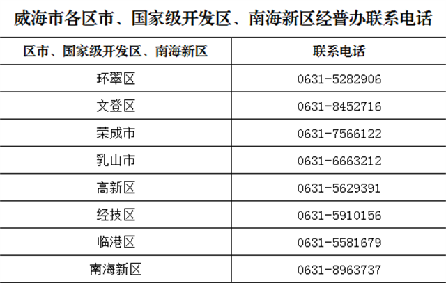 ??????威海市各區市、國家級開發區、南海新區經普辦聯系電話: