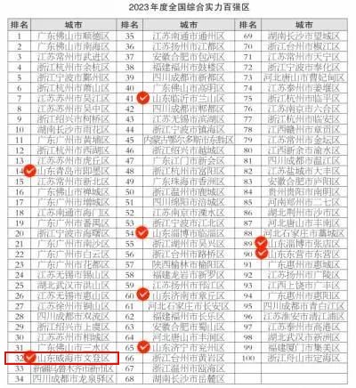 ??????2023年度全國綜合實力百強區(qū)榜單中,山東共有8地入選,其中威海市文登區(qū)上榜。