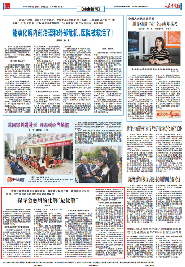 近日,《人民法院報(bào)》以《探尋金融糾紛化解“最優(yōu)解”》為題,聚焦威海法院完善專(zhuān)業(yè)化審判機(jī)制,聯(lián)動(dòng)多元解紛力量,提供精細(xì)化司法服務(wù),全方位推動(dòng)金融審判工作高質(zhì)量發(fā)展的經(jīng)驗(yàn)做法,以下為報(bào)道全文: