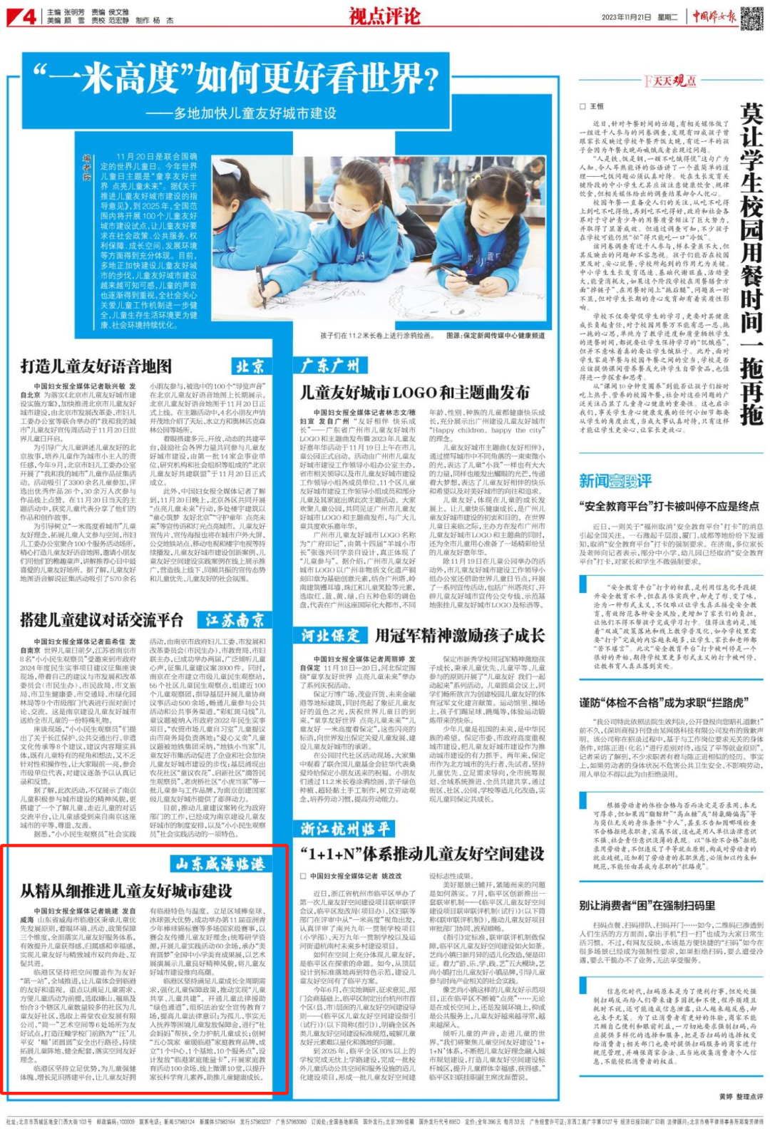 11月21日,《中國婦女報》刊發文章《山東威海臨港區 從精從細推進兒童友好城市建設》,報道威海臨港區從精從細推進兒童友好城市建設的經驗做法。以下為報道全文——