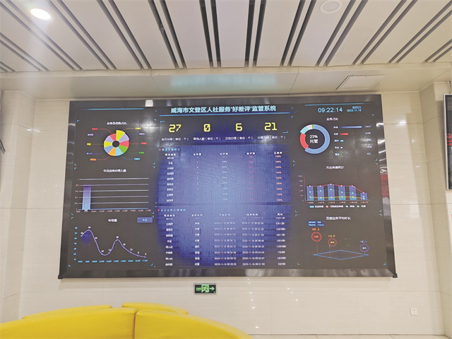??????11月16日,在文登區人社綜合服務大廳的大屏幕上,業務辦件量、業務辦理時長、群眾滿意率和群眾辦理業務類型等人社服務“好差評”監管系統的各項數據,正以圖表形式實時顯示。