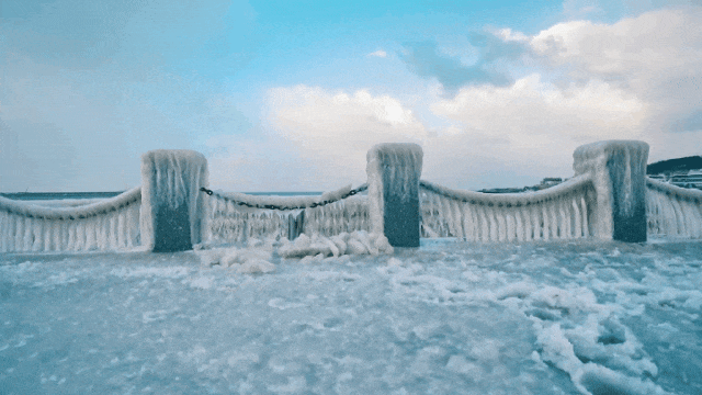 ????漫步在被冰雪封印的海邊棧道上,仿佛一秒穿越到“冰河世紀(jì)-威海分紀(jì)”。