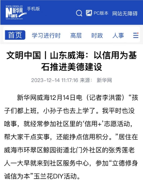 ??????12月14日,新華網(wǎng)以《文明中國(guó)丨山東威海:以信用為基石推進(jìn)美德建設(shè)》為題,對(duì)威海以信用建設(shè)促道德提升,探索信用威海與美德威海相互賦能的實(shí)踐路徑進(jìn)行報(bào)道,以下為報(bào)道全文: