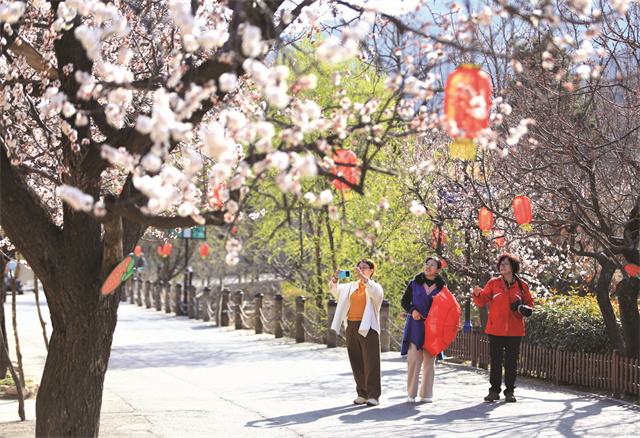 ??????在里口山王家疃“慢街”,游客們正漫步賞花,暢享休閑鄉村游。