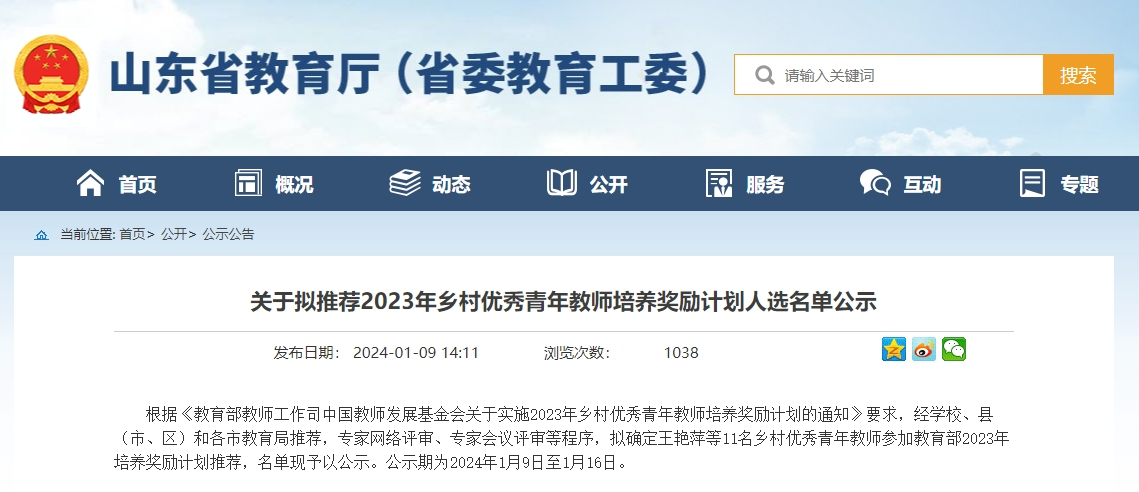 ??????根據《教育部教師工作司中國教師發展基金會關于實施2023年鄉村優秀青年教師培養獎勵計劃的通知》要求,經學校、縣(市、區)和各市教育局推薦,專家網絡評審、專家會議評審等程序,擬確定王艷萍等11名鄉村優秀青年教師參加教育部2023年培養獎勵計劃推薦,名單現予以公示。公示期為2024年1月9日至1月16日。