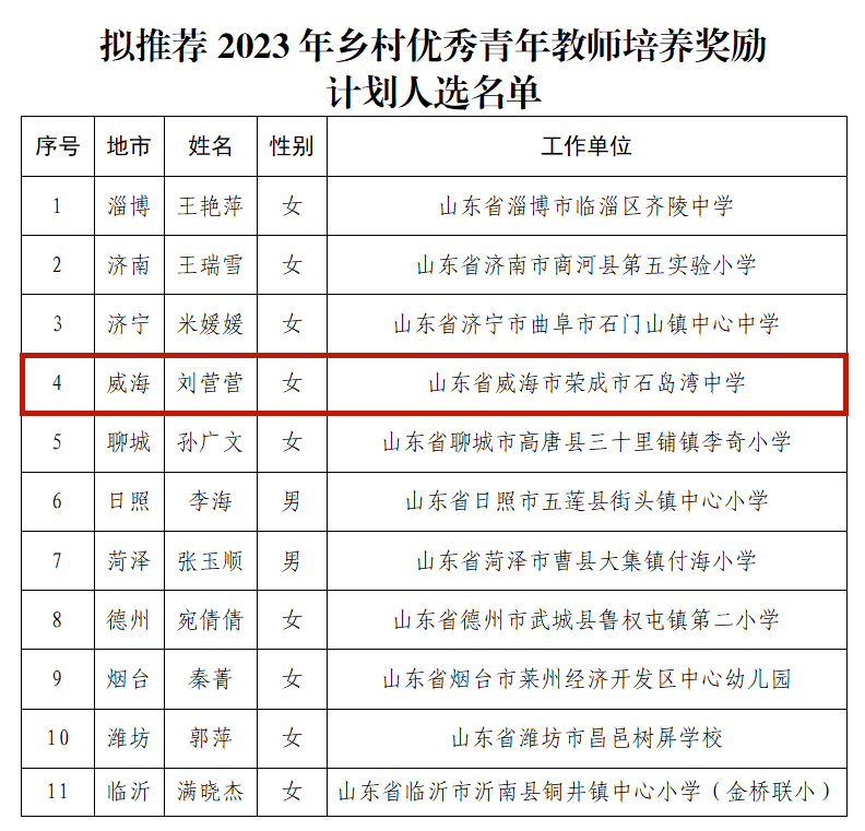 ??????近日,山東省教育廳發布《關于擬推薦2023年鄉村優秀青年教師培養獎勵計劃人選名單公示》,榮成市石島灣中學的劉營營上榜。