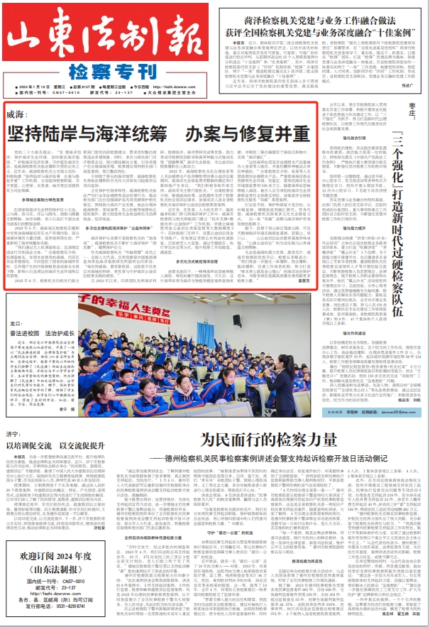 近日,《山東法制報》以《威海:堅持陸岸與海洋統籌,辦案與修復并重》為題,聚焦威海檢察機關護航海洋經濟發展的典型經驗,以下為報道全文: