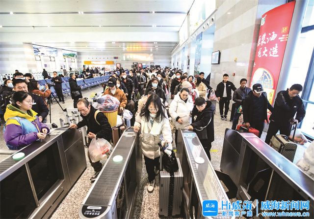 ??????當天9時30分,在威海站候車大廳,準備乘坐由威海發往蘭州西的G2684次列車的旅客正在排隊,逐一進站。“回家過年了,好開心!”老家蘭州的王子洋拖著兩個大行李箱高興地說,箱子里裝滿了給家人帶的禮物和威海特產,想把威海的好東西都帶回家,分享給親人和朋友。