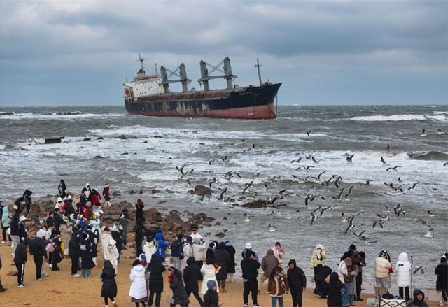 ??????浪花層疊,海鷗盤旋,相機快門聲不斷……新春假期,山東威海一處沙灘上,青年游客絡繹不絕,他們不只是來看海,更為觀賞一艘輪船。