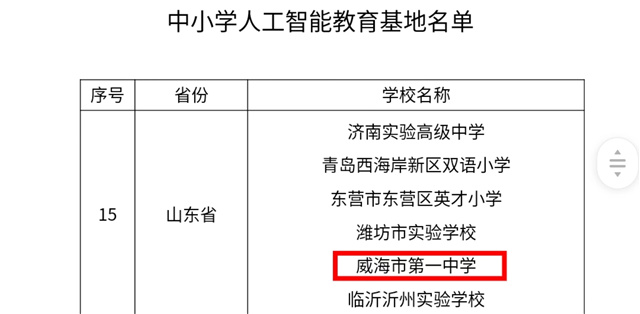 ????2月23日,教育部公布了中小學人工智能教育基地名單,全國184所學校入選,威海市第一中學在名單之列。