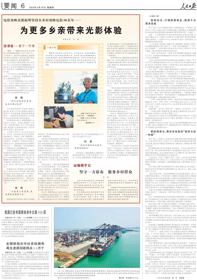 “我們還通過電影把農(nóng)業(yè)技術(shù)送到田間地頭。”都振明說,通過放映科普影片推動(dòng)村民增收致富,也是自己義務(wù)放映的重要目標(biāo)。近年來,通過放映科教片,以寓教于樂的方式普及科學(xué)知識(shí)、傳播先進(jìn)技術(shù)越來越受村民歡迎。“我們提高科教片的放映量,傳播農(nóng)業(yè)種植技術(shù)、衛(wèi)健知識(shí),實(shí)打?qū)崕椭迕駛兘鉀Q問題?!卑睬鹗须娪鞍l(fā)行放映有限責(zé)任公司總經(jīng)理王俊華介紹,去年,科普影片的放映量占公司義務(wù)電影放映總量的40%以上。