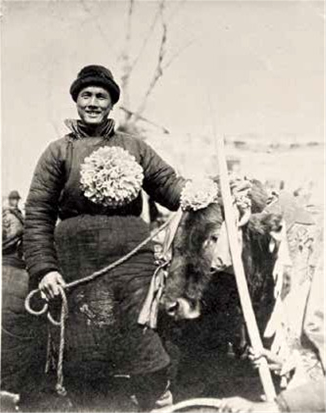 文登縣農(nóng)業(yè)勞動模范張富貴獲獎一頭老黃牛。