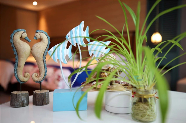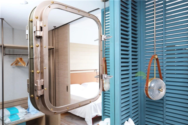 鐵錨標志的門牌號,床頭裝飾著橫放的船槳,掛于墻壁的“舷窗”化妝鏡,俏皮可愛的海洋風精致擺件,兼顧舒適與愜意的同時,海洋元素也無處不在。