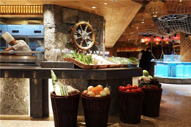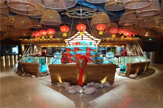 象征著敲響吉祥的漁家大鼓,漁船造型的食材展柜,以漁籠漁網為裝飾的頂棚設計,隨處可見的漁家風情讓人感受到獨特的漁民文化。