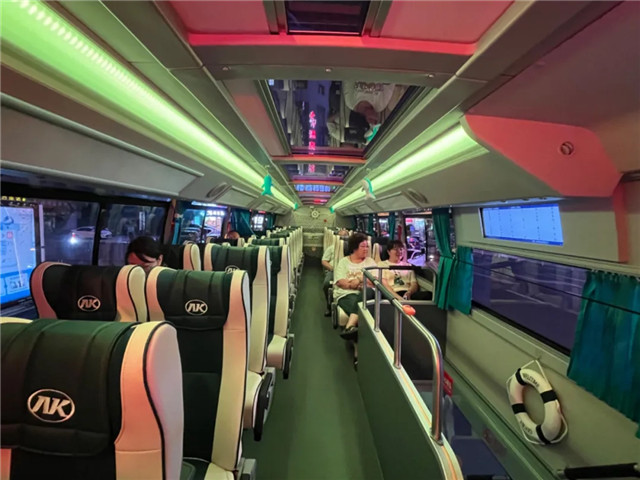 ??????與東城路—小石島夜游專線不同,此次開通的東城路—韓樂坊夜游專線承運車輛為雙層巴士,設計64座,核載126人。