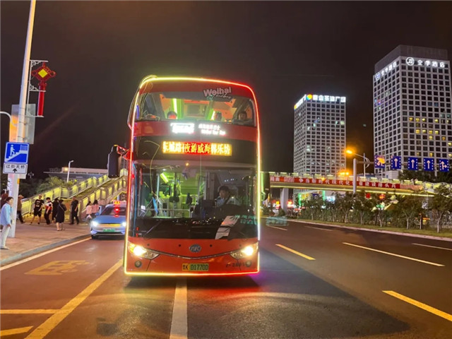 ??????6月20日晚19時18分,流光溢彩的“夜游威海”雙層巴士緩緩停靠在青島路韓樂坊(紅星美凱龍)站點,東城路—韓樂坊夜游專線開通上線。這是繼東城路—小石島夜游專線6月2日上線試運行后,威海公交集團推出的第二條“夜游威海”定制觀光專線。