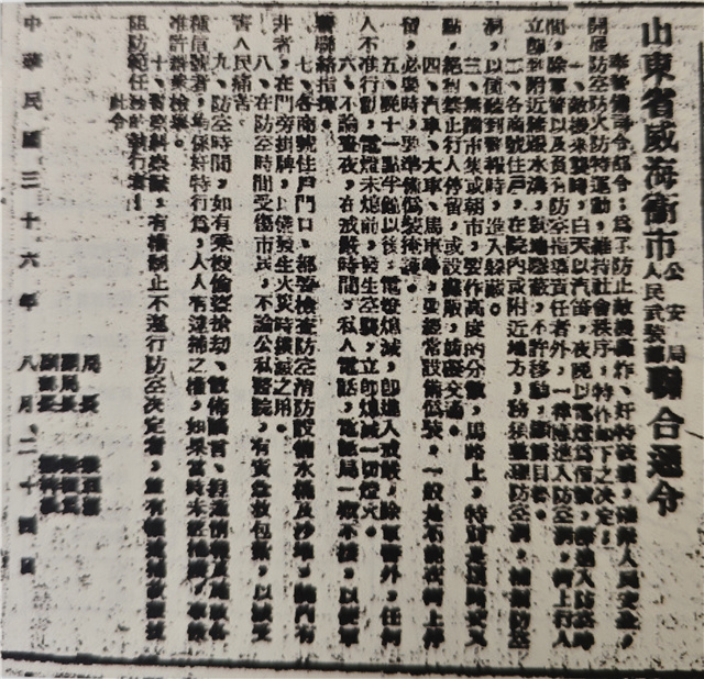 1947年,威海衛(wèi)市公安局、人民武裝部關(guān)于保衛(wèi)戰(zhàn)的聯(lián)合通令