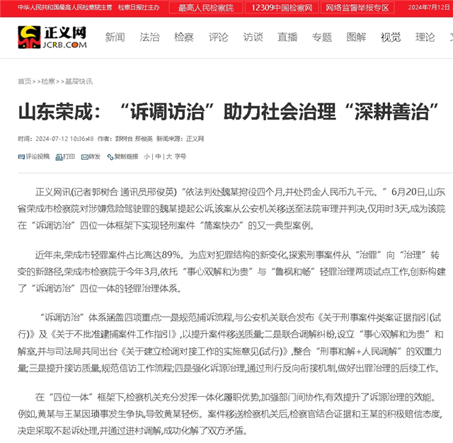 7月12日,正義網(wǎng)以《山東榮成:“訴調(diào)訪治”助力社會治理“深耕善治”》為題,聚焦威海榮成市檢察院對輕刑案件“簡案快辦”的先進經(jīng)驗,以下為報道全文: