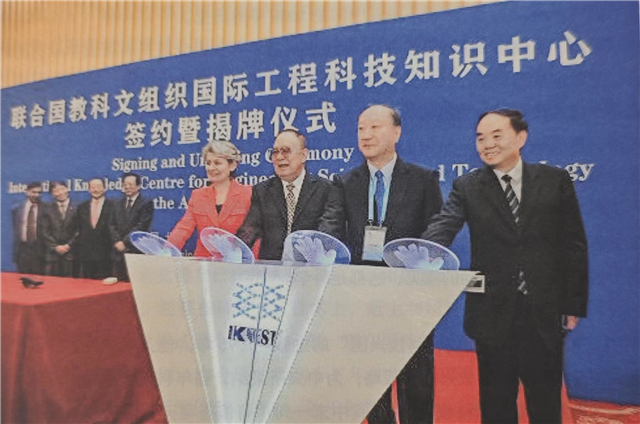 宋健(右三)出席聯合國教科文組織國際工程科技知識中心簽約暨揭牌儀式