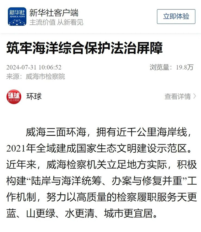 近日,新華社客戶端以《威海:筑牢海洋綜合保護法治屏障》為題,聚焦威海檢察機關立足地方實際,筑牢海洋綜合保護法治屏障的先進經驗,以下為報道全文: