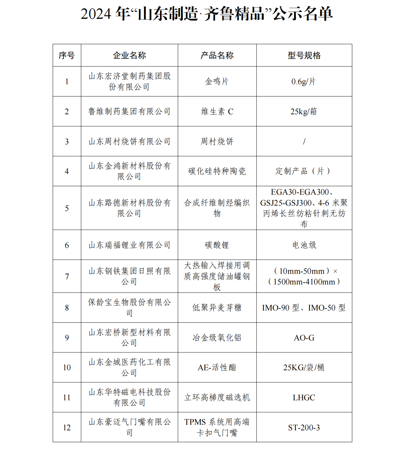 關(guān)于2024年“山東制造·齊魯精品”名單的公示