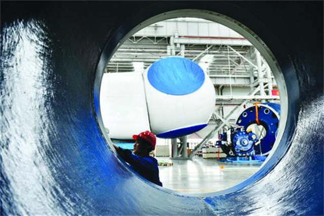 在明陽北方(乳山)高端海洋裝備智能制造產(chǎn)業(yè)基地內(nèi),工人正在組裝風(fēng)電主機(jī)。于瑄 攝