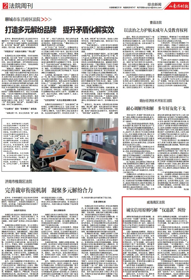 近日,《山東法制報》以《威海高區法院誠實信用原則巧解“僅退款”糾紛》為題,聚焦威海高區法院合理化解網絡買賣合同糾紛,以下為報道全文: