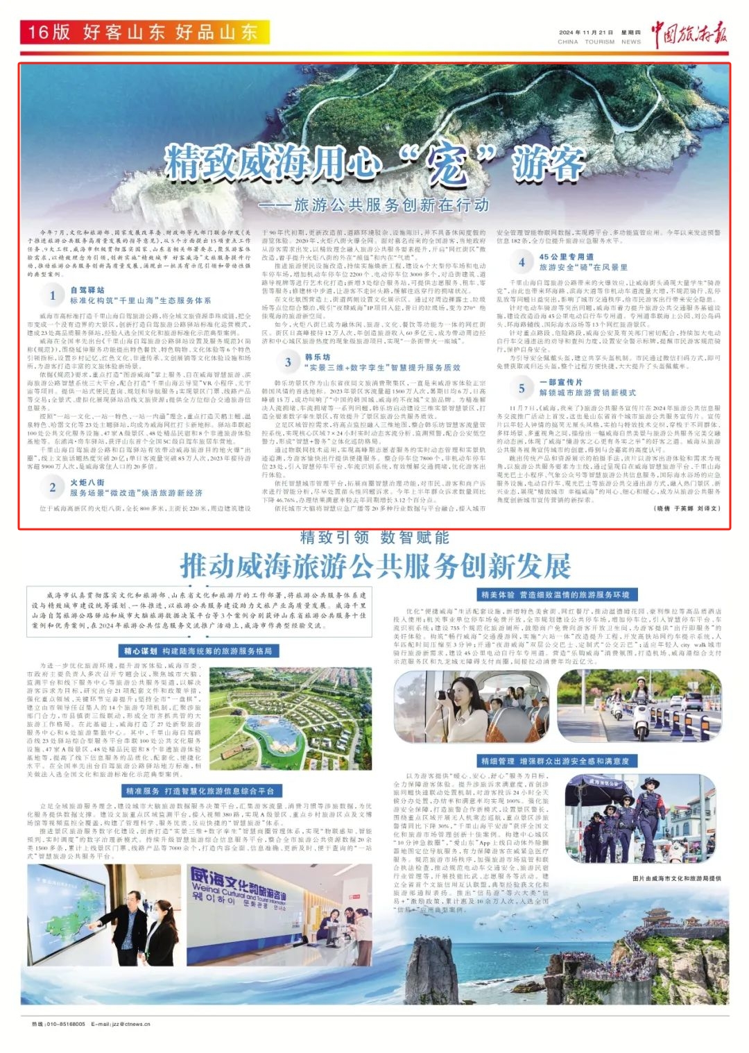 11月21日,《中國旅游報》刊發《精致威海用心“寵”游客——旅游公共服務創新在行動》一文,聚焦威海在文旅服務提升及推動旅游公共服務創新等方面的典型案例和優秀做法。以下為報道全文: